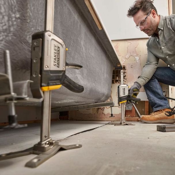 Mit dem stufenlos verstellbaren Hebelarm lassen sich selbst bis zu 150 kg schwere Objekte – wie zum Beispiel Badewannen – mühelos anheben und halten. Die stabile Standfläche bietet sicheren Halt auch auf unebenen Untergründen, während der Arretiermechanismus ungewollte Bewegungen während der Montage verhindert.