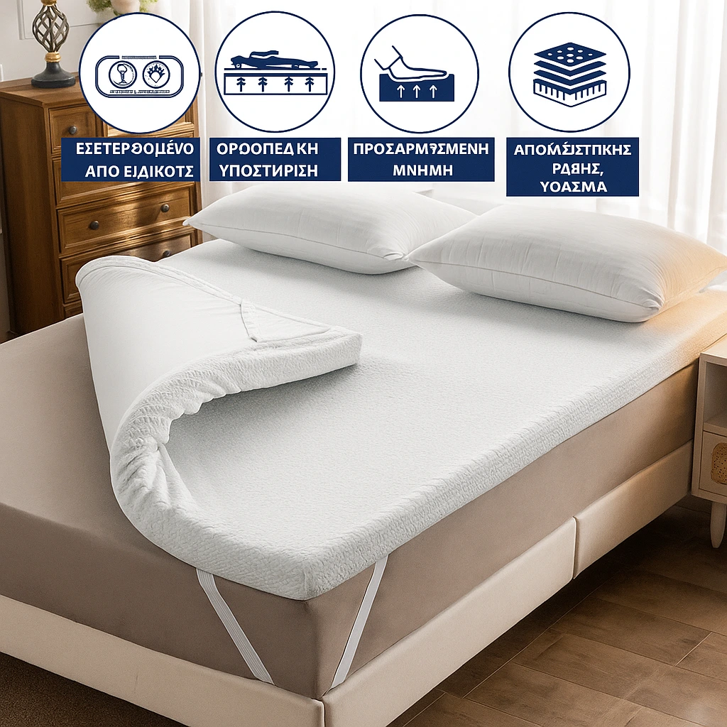 Το topper μας προσαρμόζεται τέλεια στις καμπύλες του σώματος, προσφέροντας εξειδικευμένη στήριξη για το κεφάλι, τους ώμους, την πλάτη, τους γοφούς, τα πόδια και τα πέλματα.