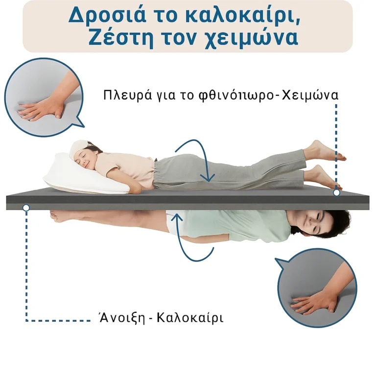 Η πλευρά Άνοιξη/Καλοκαίρι είναι δροσερή και στεγνή, ιδανική για τα ζεστά καλοκαιρινά βράδια, προσφέροντάς σου αίσθηση φρεσκάδας.