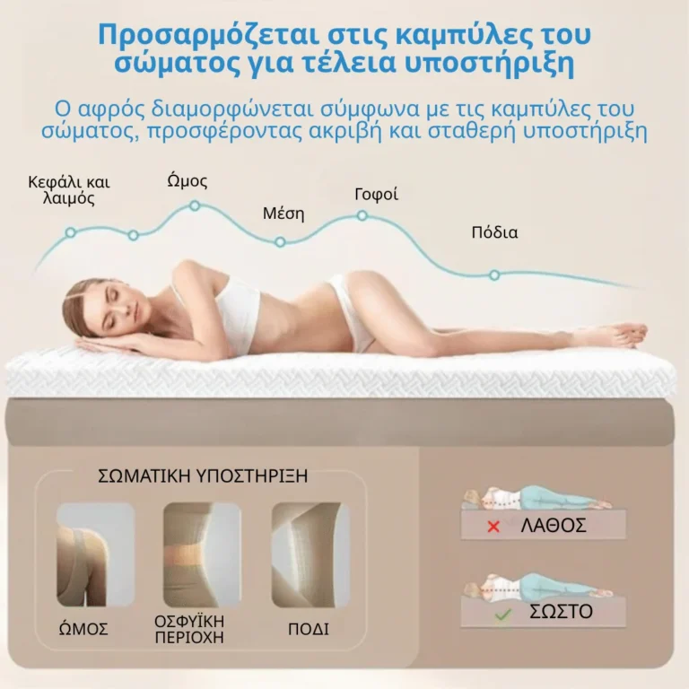Ο αφρός προσαρμόζεται στις καμπύλες του σώματος, κατανέμοντας ομοιόμορφα το βάρος και μειώνοντας την πίεση στους ώμους, την πλάτη, τον αυχένα και τους γοφούς.